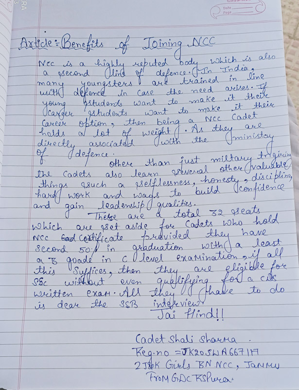 Cadet Shali Sharma 2J&K Girls BN NCC, Jammu FROM GDC RS PURA