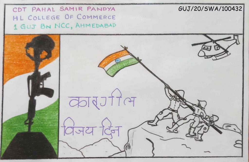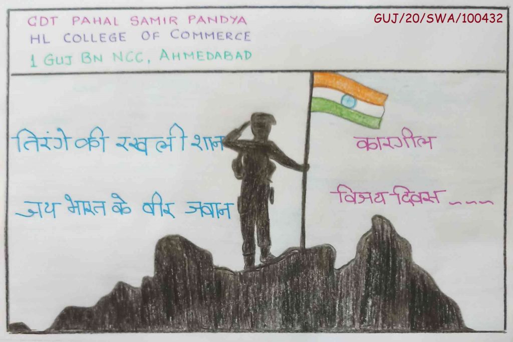 This card was by me, as a part of our NCC initiative to pay tribute to our KARGIL HEROS. CDT PANDYA PAHAL SAMIR GUJ/20/SWA/100432 H. L. COLLEGE OF COMMERCE, AHMEDABAD 1 GUJ BN NCC, AHMEDABAD GUJARAT, DADRA NAGAR HAVELI, DIU & DAMAN.