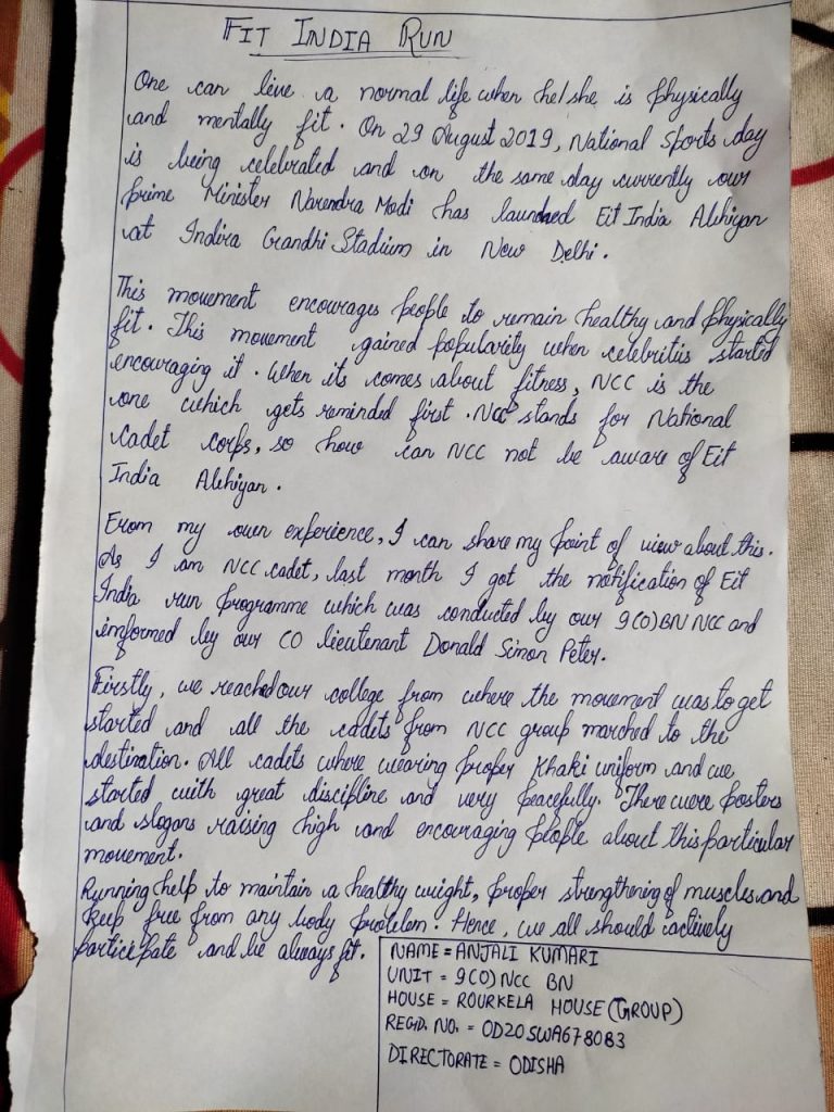 Name=Anjali kumari Regimental no. =OD20SWA678083 Unit= 9(o) BN NCC Directorate=Odisha