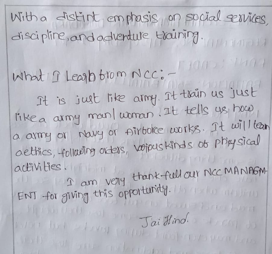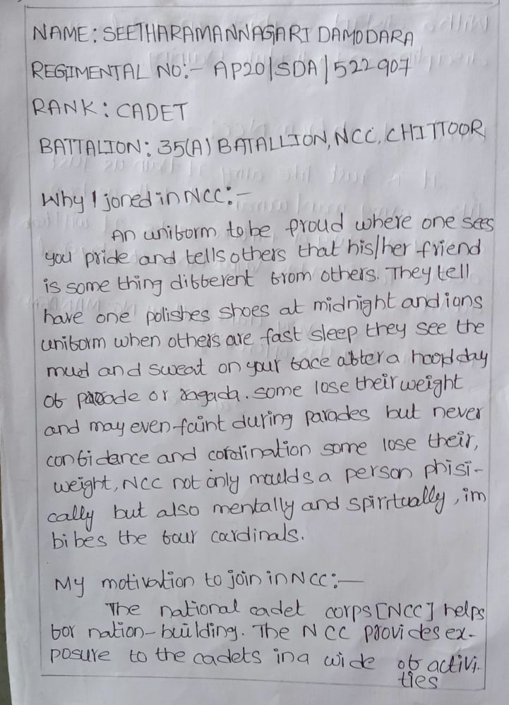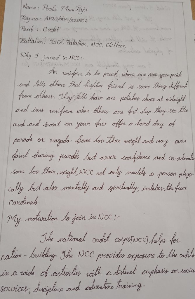 Name: Poola Muniraja Reg no:AP20/SDA/522904 Rank:Cadet Battalion:35(A)Battalion, NCC, Chittoor.