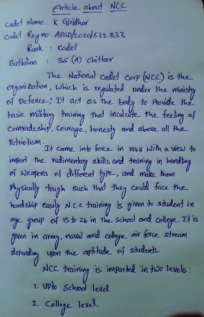 Cadet name:K Giridhar Cadet Reg no:APSD/2020/522333 Rank:Cadet Battalion:35(A) Chittoor