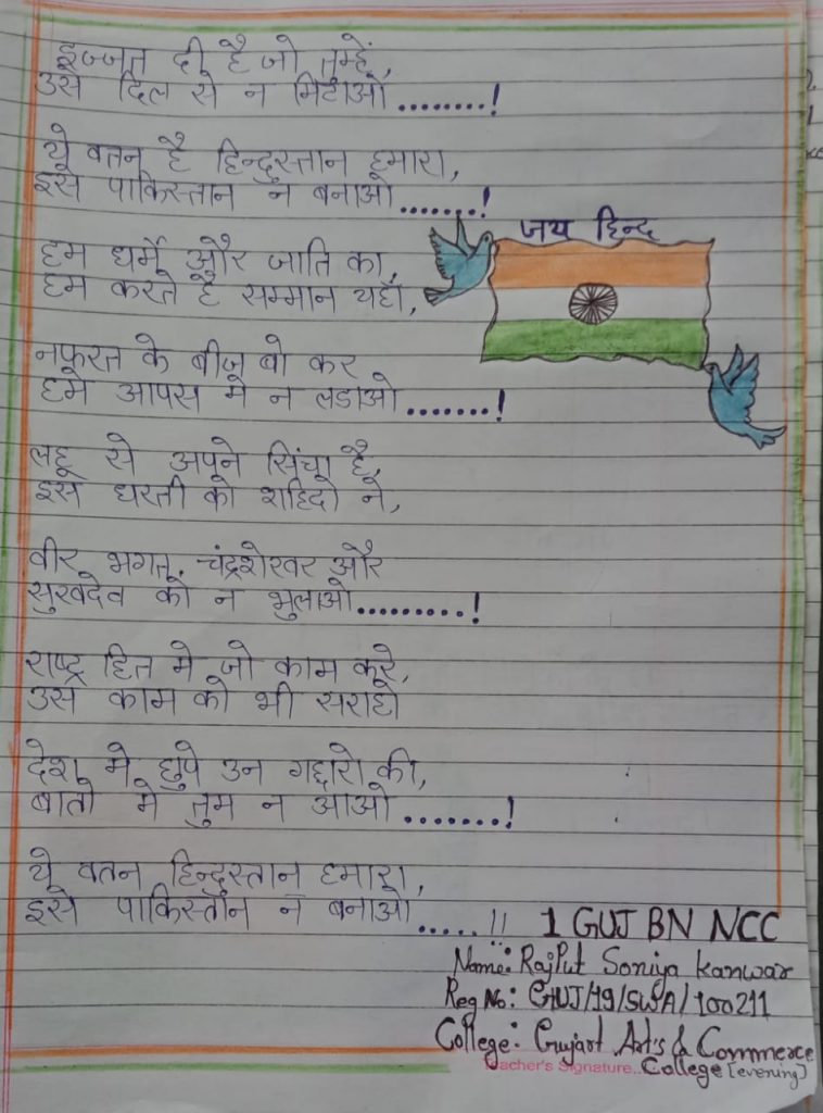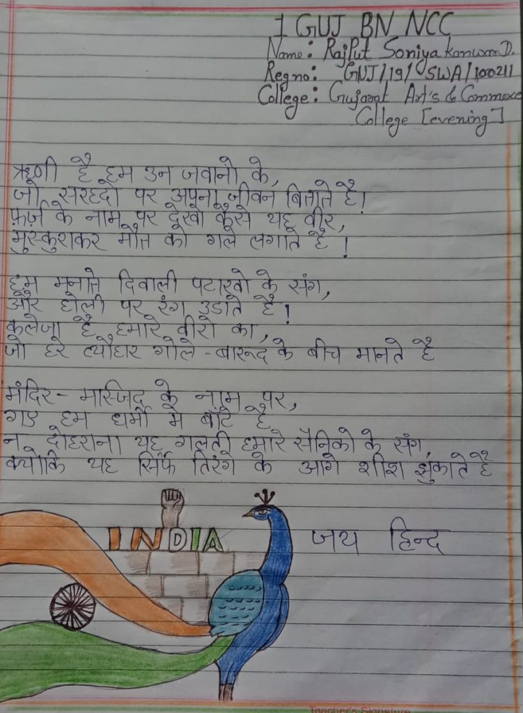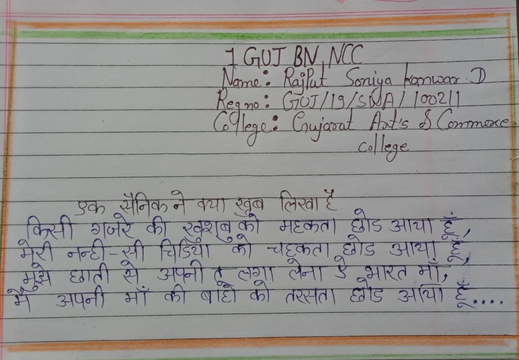 CDT Rajput Soniya Kanwar Dilip Singh ,Gujarat Arts &Commerce College (evening )Ahmadabad Gujarat, 1 BN NCC Ahmedabad , Gujarat DD&DNH