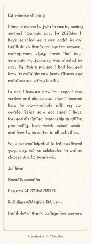 This is Cadet Shrishti Vishwakarma from 4 MP girls Battalion NCC Bhopal second year, Oriental institute of science and technology bhopal.