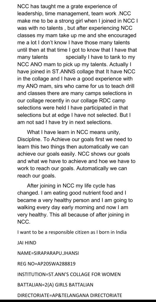 Cadet: S. Rakshitha Reg no: AP19/SWA/521657 35(A) Battalion,chittoor MITS NCC