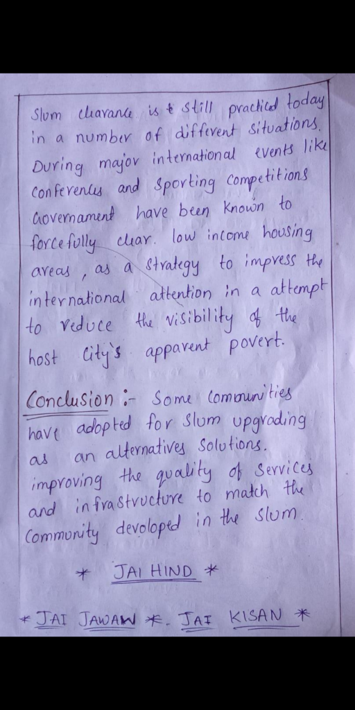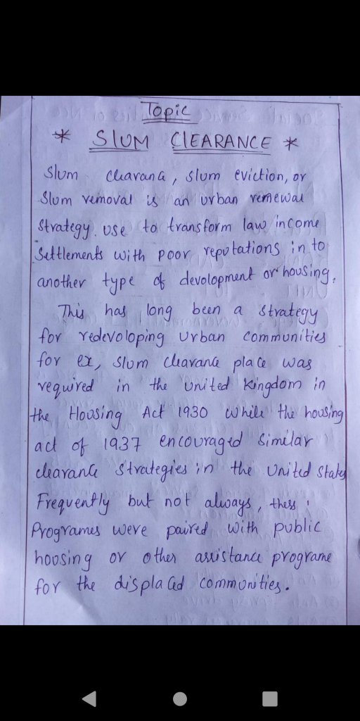 Slum clearence, slum eviction,slum removal is an urban removal strategy use to trans form law income settlements with poor reputations Into another type of devolopment