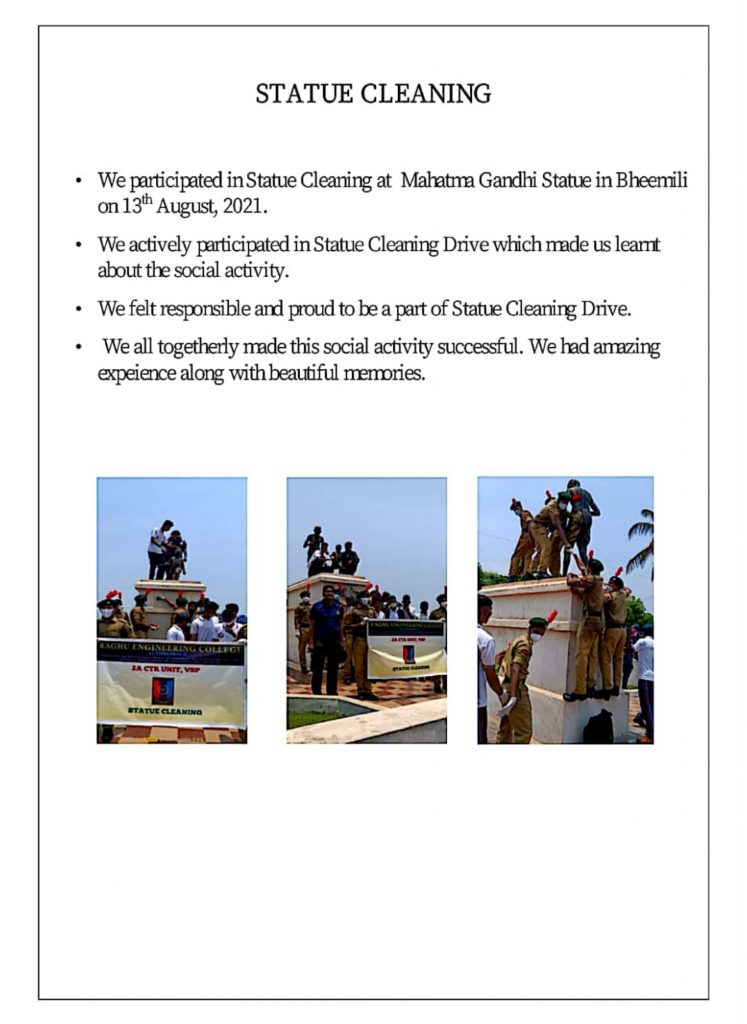 All NCC Group took to statue cleaning. A strength of NCC cadets made the event a success with enthusiasm. “Mahatma Gandhi Statue Activity” Statue Cleaning Drive was carried out by the NCC Cadets. Statue of Mahatma Gandhi located at Bheemili Beach
