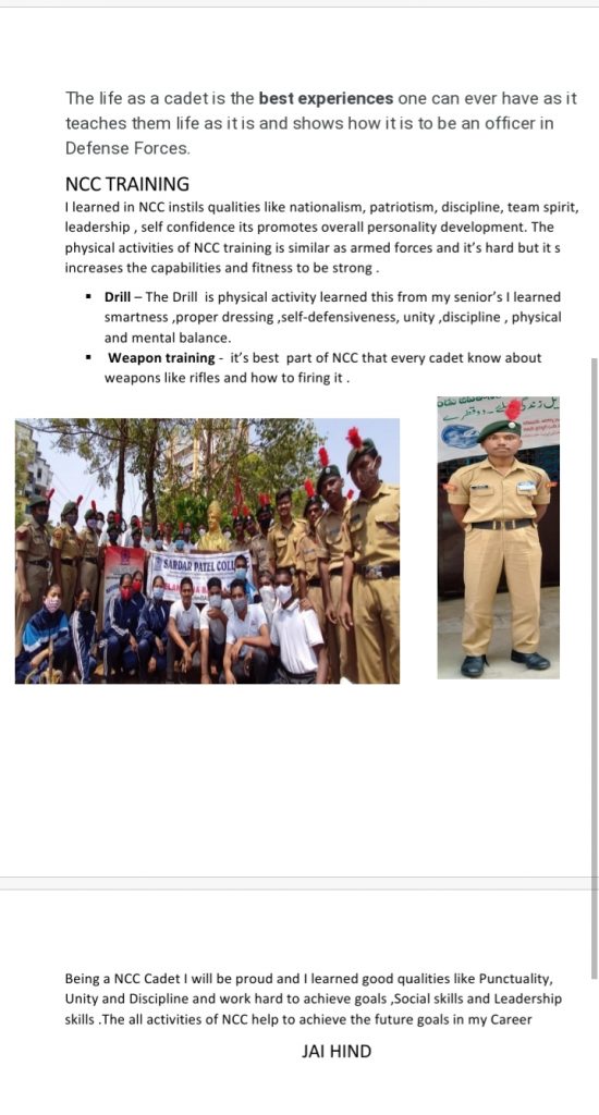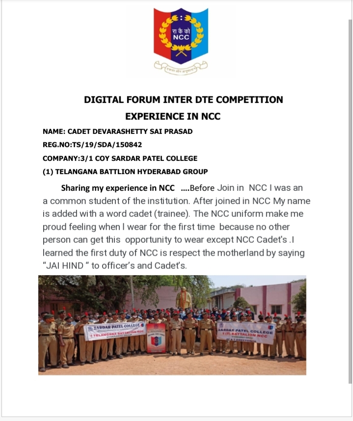 CDT DEVARASHETTY SAI PRASAD BEARING REG NO TS/19/SDA/150842 SARDAR PATEL COLLEGE 1 TELANGANA BATTLION HYDERABAD GROUP AP&T DIRECTORATE