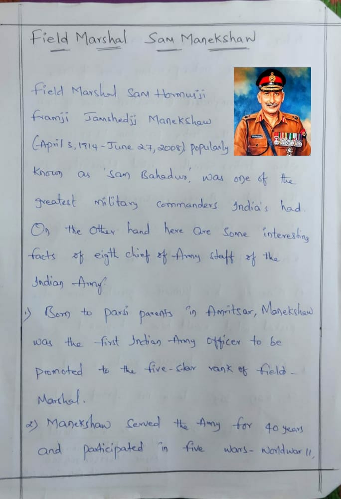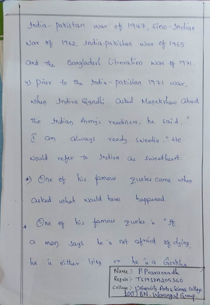 MY SELF CDT P PRAVANNADH, TS19SDA205360, 10(T) BN, WARANGAL GROUP. ABOUT THE LATE FIELD MARSHAL SAM BAHADUR MANEKSHAW.
