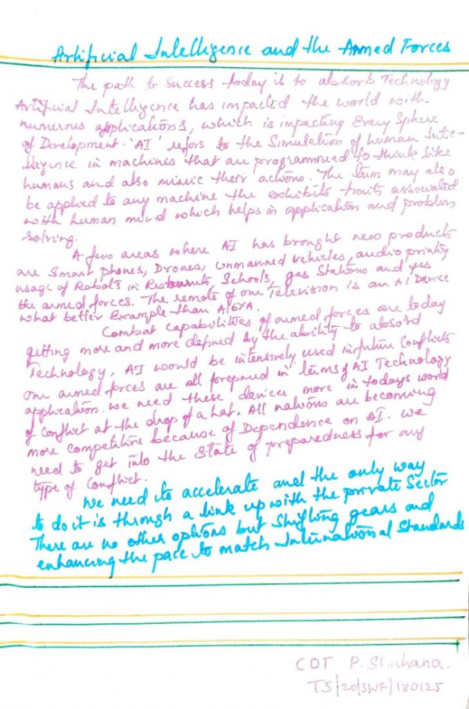 Cadet P Shahana Reg no: TS/20/SWF/180125 Unit: 1(T) Air Sqn NCC, grp: Hyderabad, AP&T Directorate Article on: Artificial Intelligence And The Indian Armed Forces