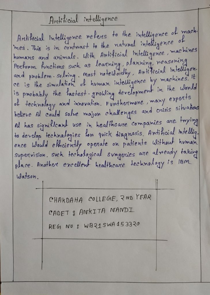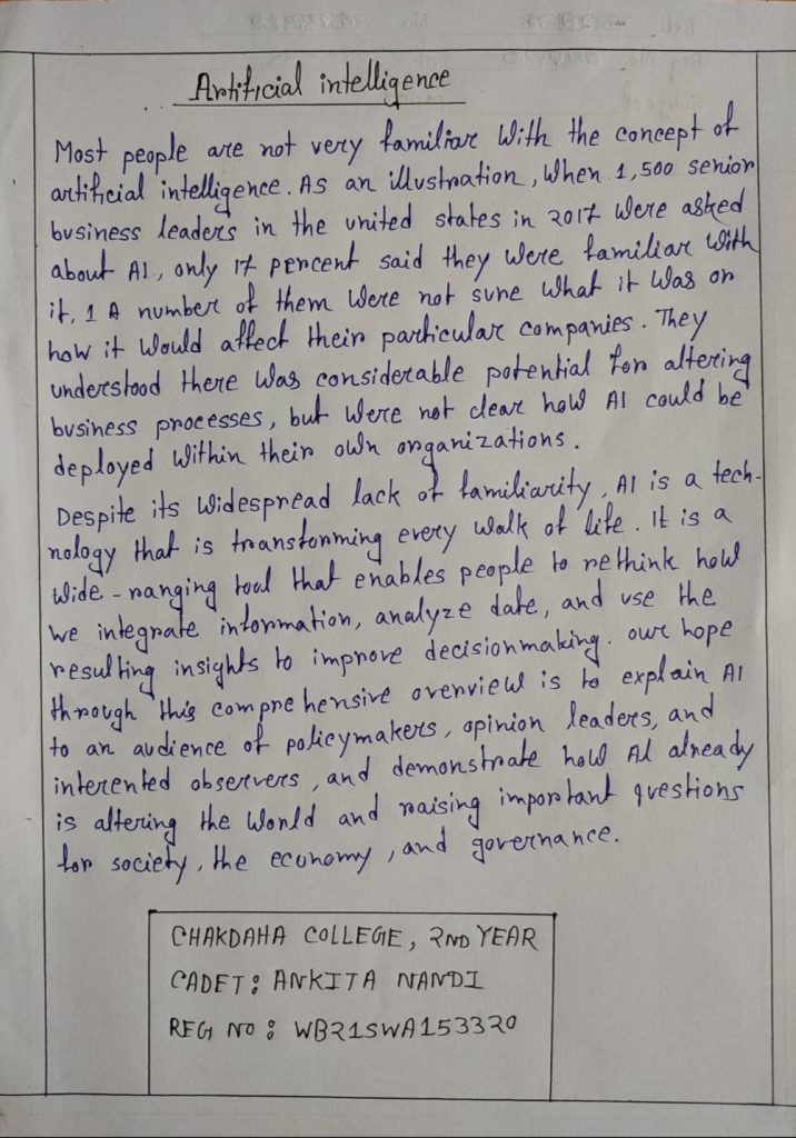 I am Ankita Nandi, Reg Number: WB21SWA153320, writing about Artificial Intelligence.