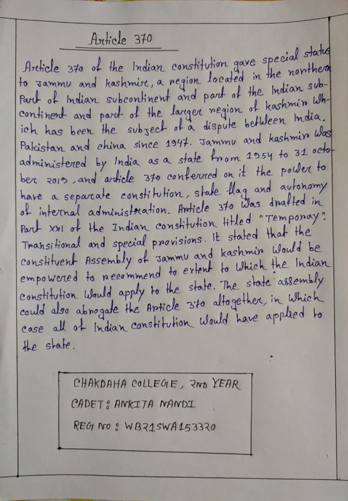 I am Ankita Nandi, Reg Number: WB21SWA153320, writing about Article 370.