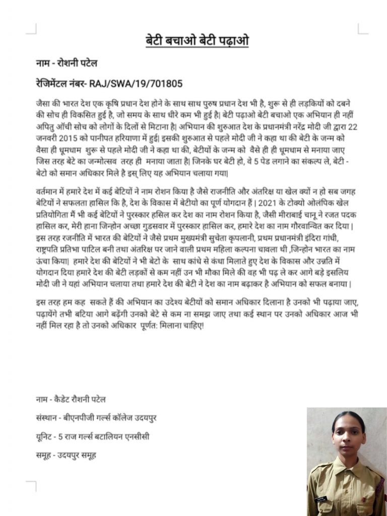 Cadet Supriya Pawar Regd. No. Jk19 Swa666280 College - Government degree College Akhnoor Activity- fit india movement