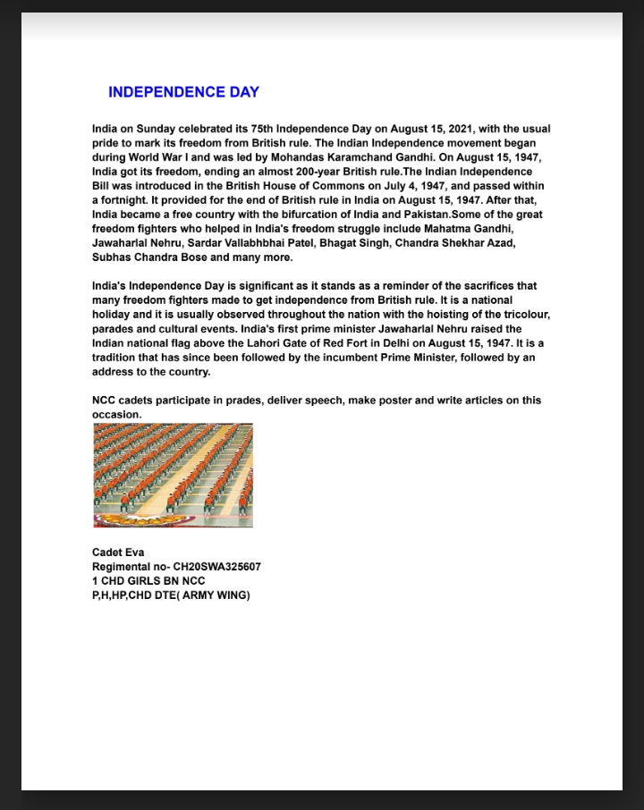 Cadet Eva Regimental no- CH20SWA325607 1 CHD GIRLS BN NCC P,H,HP,CHD DTE.