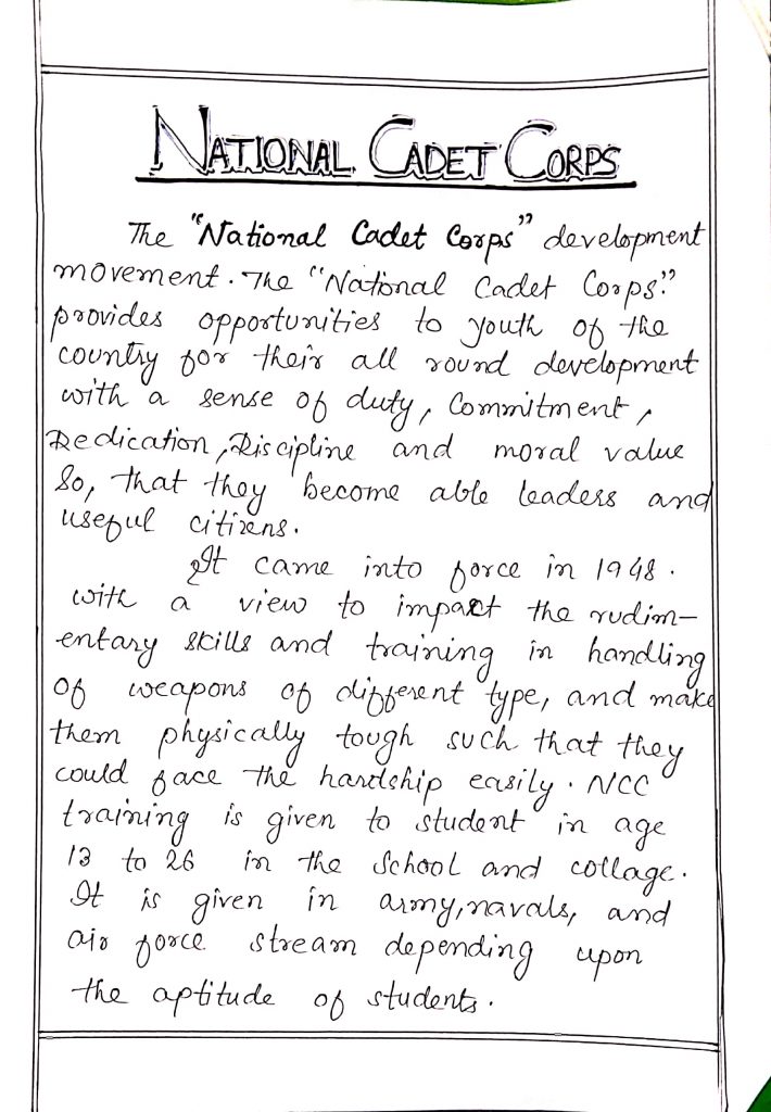 I am a first year junior division/ wing cadet of 41 NCC and I belong to........ school. I am privileged to be part of NCC the biggest youth organization in the world . My hobbies are playing cricket, painting , listening to music