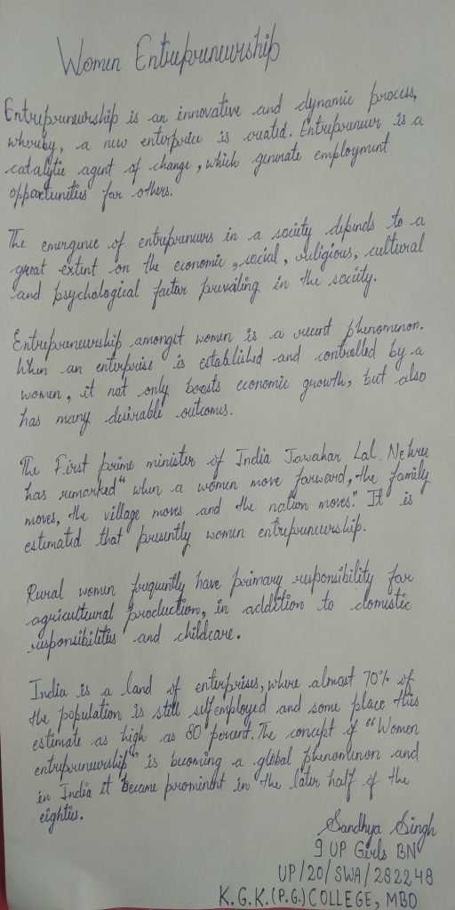 Essay on Women Entrepreneurship by Sandhya Singh, UP/20/SWA/282248, NCC Second Year Cadet, K.G.K.(P.G.) College, Moradabad