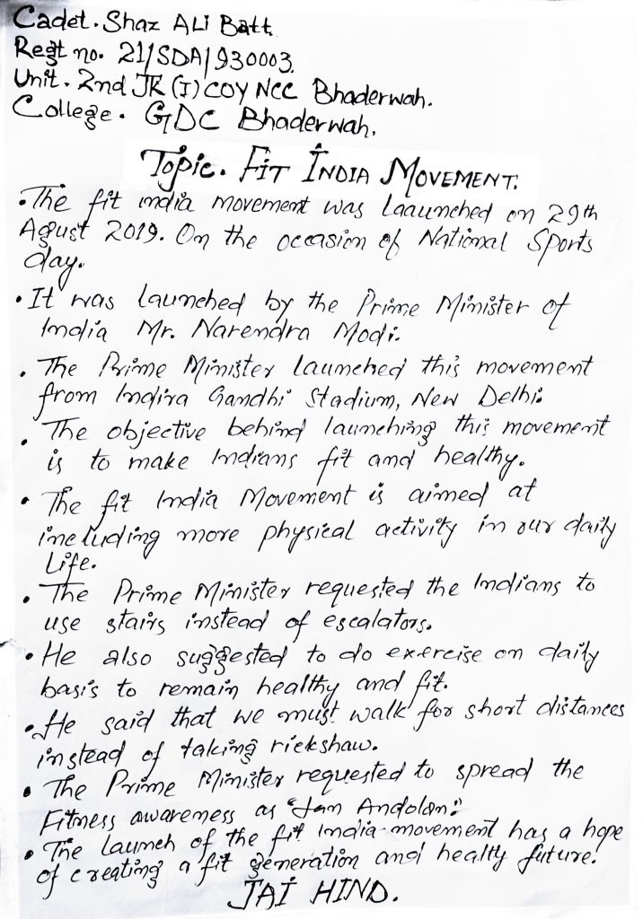 Cadet. Shaz Ali Batt Regt no.JK/21/SDA/930003 Unit.2nd JK (I) COY NCC Bhaderwah Directorate. Jammu Kashmir & Leg.