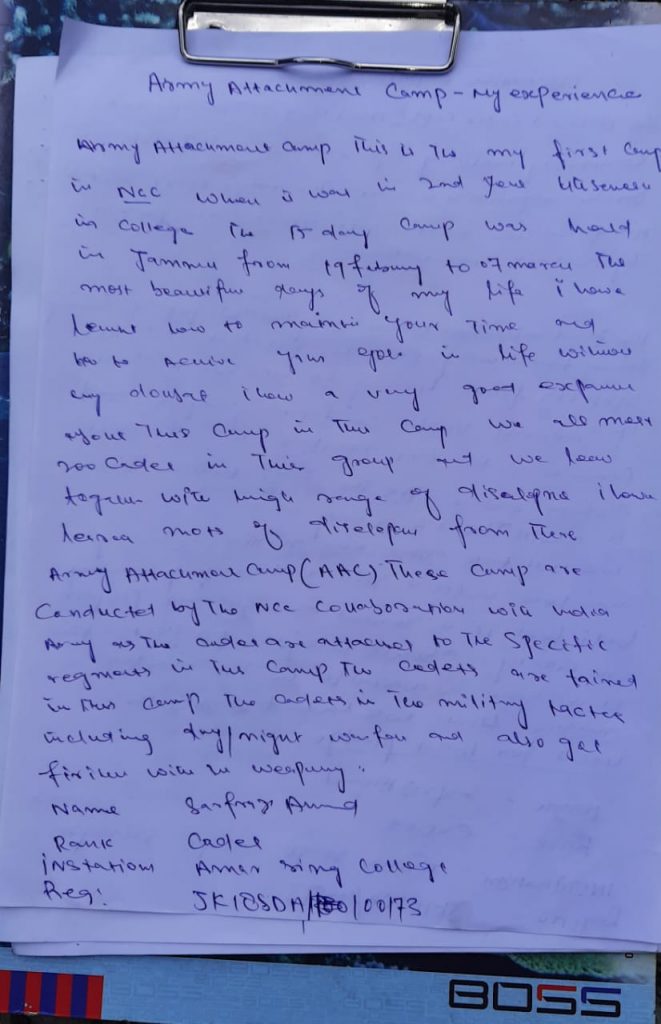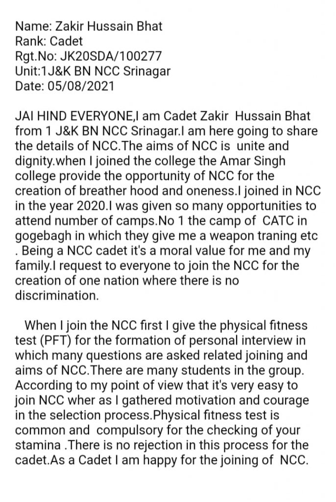 This article is written by Cadet zakir Hussain Bhat of 1 J&K Boys BN NCC Srinagar, bearing Regimental No. JK&L20SDA/100277. Institution; Amar Singh College Srinagar