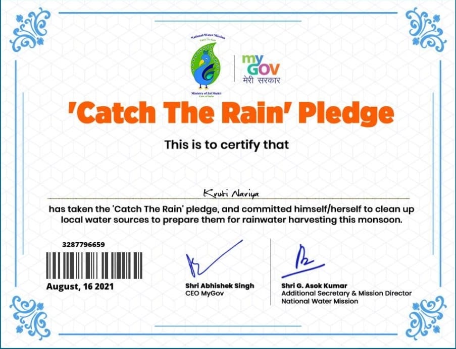 I am LC kruti nariya , Student of Darshan University & No. 8 Gujarat Naval Unit NCC-Jamnagar. I successfully taken CATCH THE RAIN PLEDGE on 16 aug 2021.