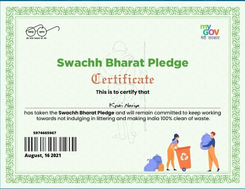 I am LC kruti nariya , Student of Darshan University & No. 8 Gujarat Naval Unit NCC-Jamnagar. I successfully taken SWACHH BHARAT PLEDGE on 16 aug 2021.