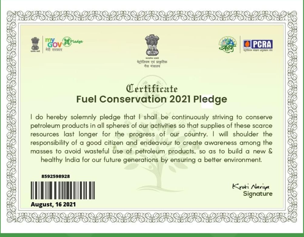 I am LC kruti nariya , Student of Darshan University & No. 8 Gujarat Naval Unit NCC-Jamnagar. I successfully taken FULE CONSERVATION 2021 PLEDGE on 16 aug 2021.