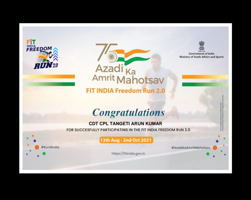 JAY HIND! I CDT RIYABEN CHAUDHARI, 4 GUJ GIRLS BN NCC V V NAGAR GRP, ANAND DNH & DD DIRECTORATE, GUJARAT. THIS IS ABOUT SUCCESSFUL PARTICIPATION IN FIT INDIA FREEDOM RUN.