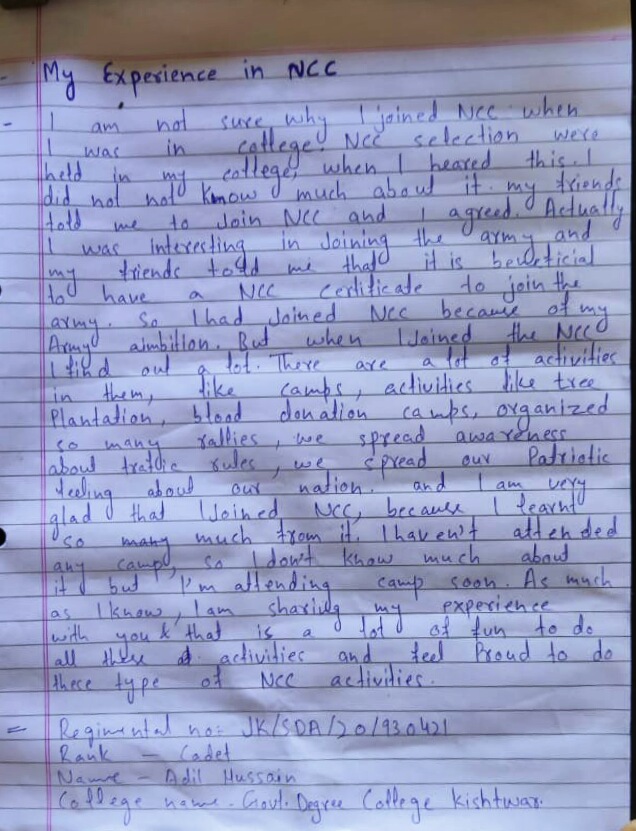 Name-Adil Hussain S/o-Ghulam Mohd Sheikh R/o-Suzna Palmar Kishtwar.Jammu and kashmir Regimental no:JK/SDA/20/930421