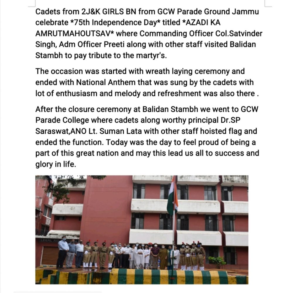 Name - Cadet Ritika REG. - JK19SWA665012 College - GCW parade
