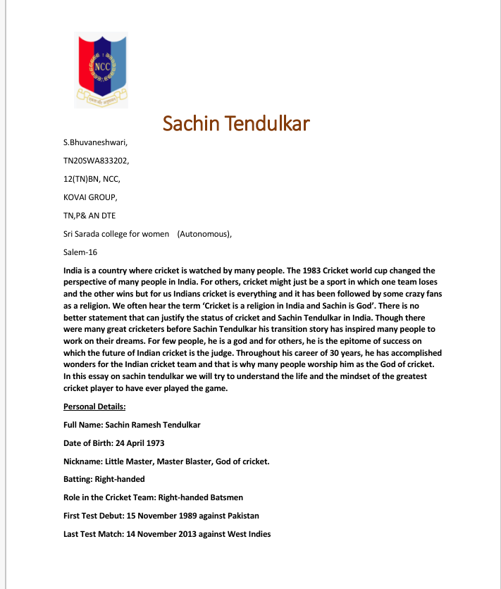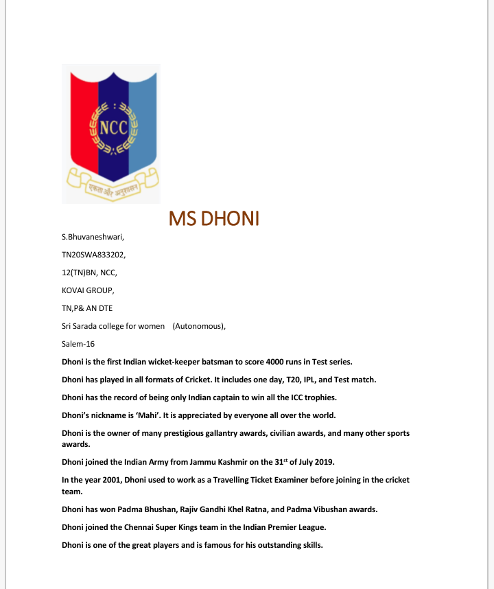 S.Bhuvaneshwari, TN20SWA833202, 12(TN)BN, NCC, KOVAI GROUP, TN,P& AN DTE Sri Sarada college for women (Autonomous), Salem-16